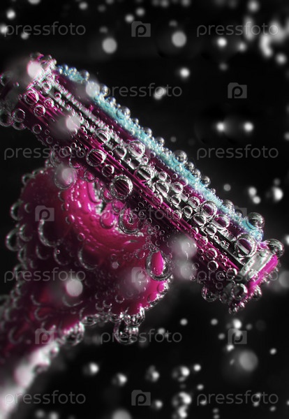 Розовое лезвие бритвы крупным планом в холодной воде с пузырьками на черном фоне. Концепция женского здоровья и красоты