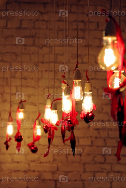 Декоративные лампочки в стиле эдисона с декором ко дню святого валентина и кирпичной стеной на заднем плане