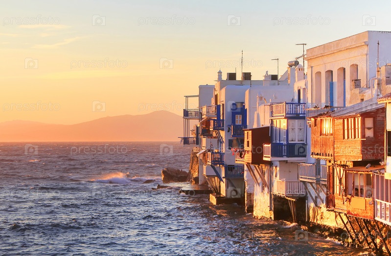 Красочная маленькая Венеция острова Миконос на закате