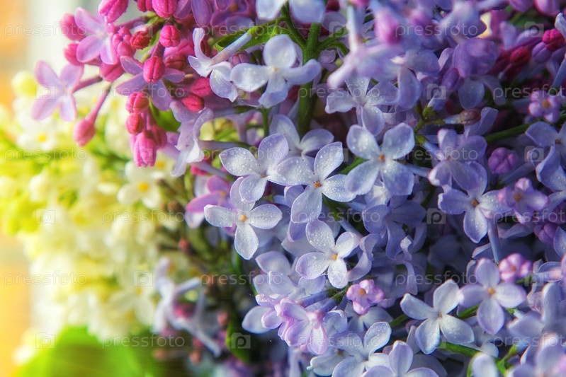 Закройте весенние сиреневые фиолетовые цветы каплями воды. Мягкий фокус, абстрактный мягкий цветочный фон