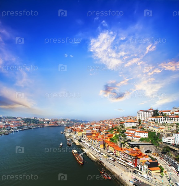 Берег реки Дору и лодки с винными бочками, Порту, Португалия. Винтажная картина