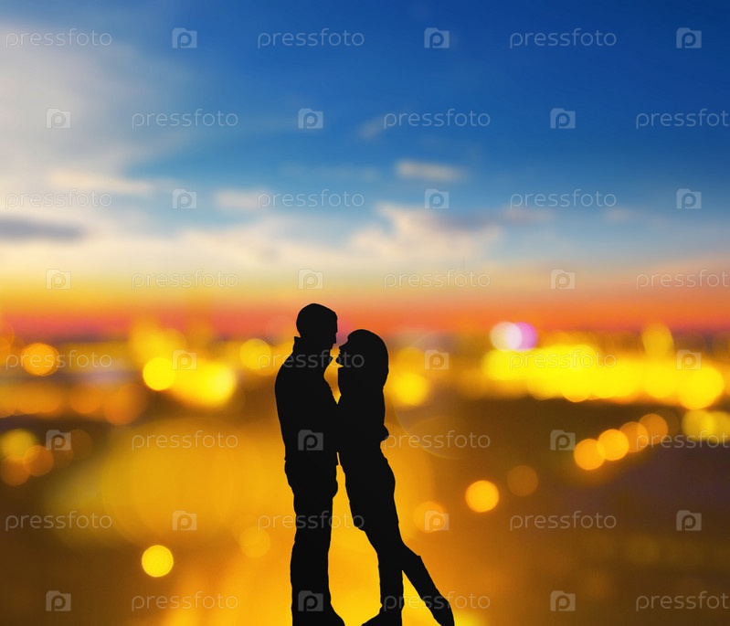 Силуэт романтических влюбленных с размытым городом на заднем плане