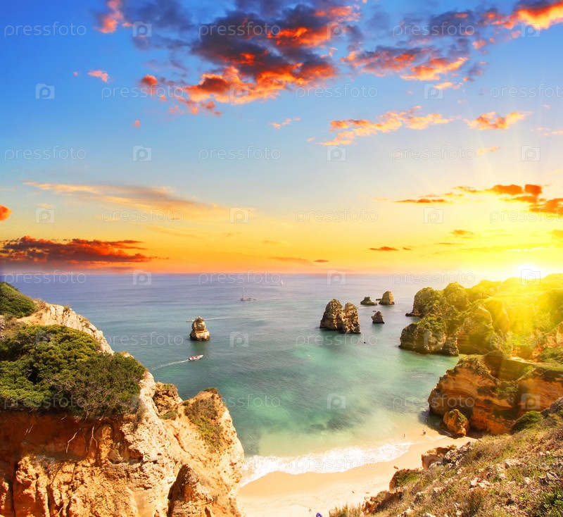 Скалистый пляж на закате, Лагос, Португалия. Счетчик света. Путешествия и бизнес фон