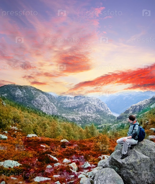 Женщина-путешественница с рюкзаком в горах Норвегии с великолепным водопадом. Красивый осенний пейзаж заката недалеко от Флама. Экстремальный фон в винтажном стиле