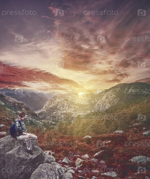 Женщина-путешественница с рюкзаком в горах Норвегии с великолепным водопадом. Красивый осенний пейзаж заката недалеко от Флама. Экстремальный фон в винтажном стиле