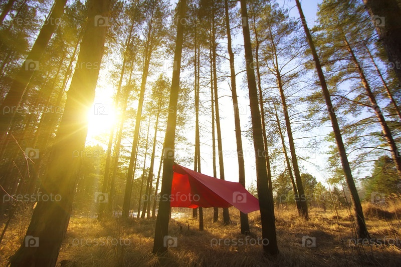 Сосны и красный гамак с палаткой в весеннем лесу. Концепция путешествий и приключений в винтажном стиле