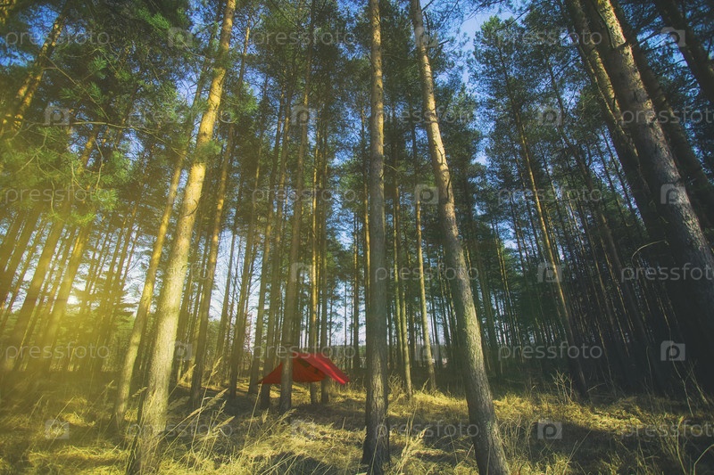 Сосны и красный гамак с палаткой в весеннем лесу. Концепция путешествий и приключений в винтажном стиле