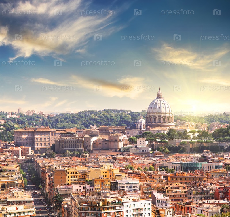 Вид с воздуха на собор Святого Петра в Риме, Италия, на закате. Встречный световой выстрел. Концепция бизнеса, любви и путешествий