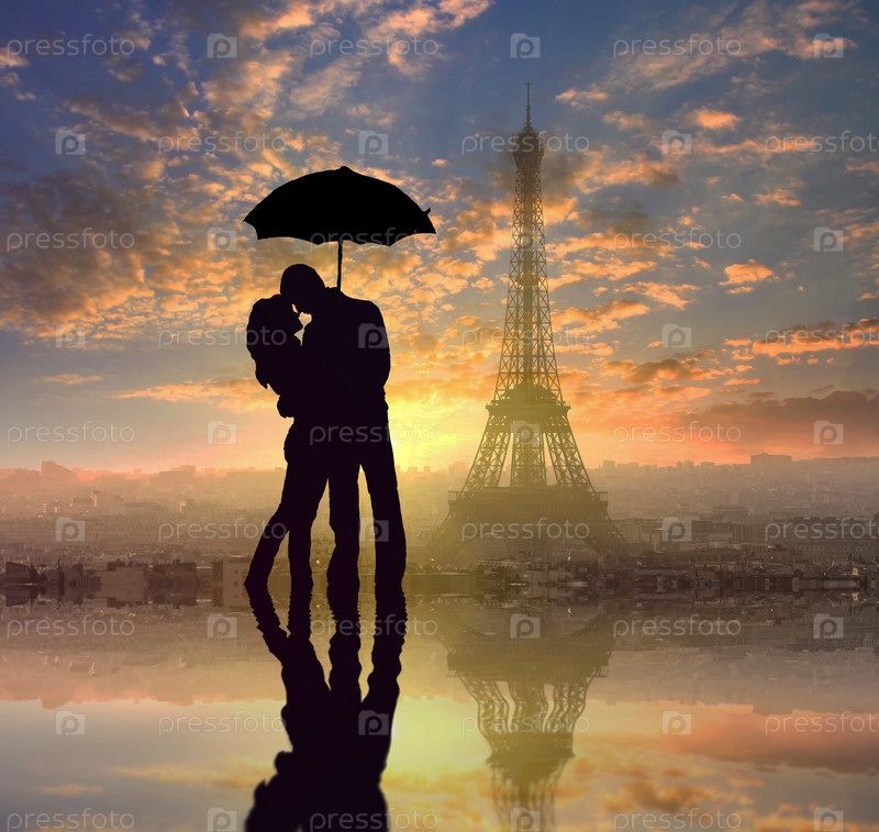 Силуэт пары, стоящей в снежной буре под красным зонтиком с Эйфелевой башней в Париже, Франция на заднем плане, абстрактная красочная романтическая картина