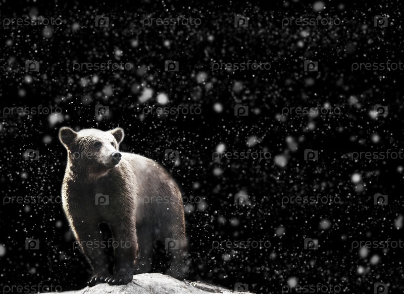 Зимний портрет медведя с темнотой и снегом на заднем плане. мягкий фокус черно-белая картинка