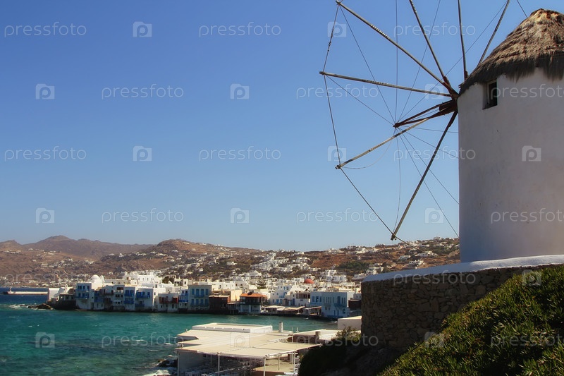 Вид на Миконос и знаменитую ветряную мельницу, остров Миконос, Греция