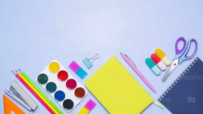 Рамка из разноцветных канцелярских принадлежностей на голубом фоне