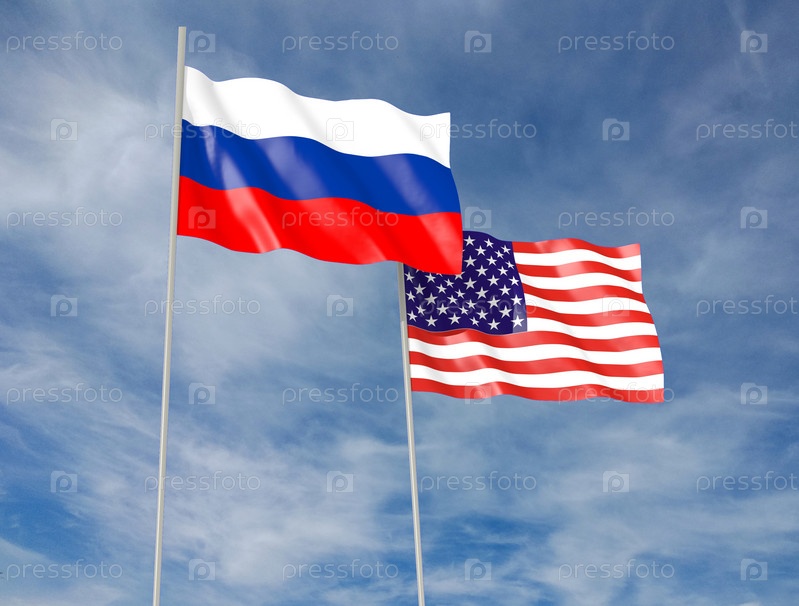 Развевающиеся флаги Российской Федерации и США рядом на фоне неба