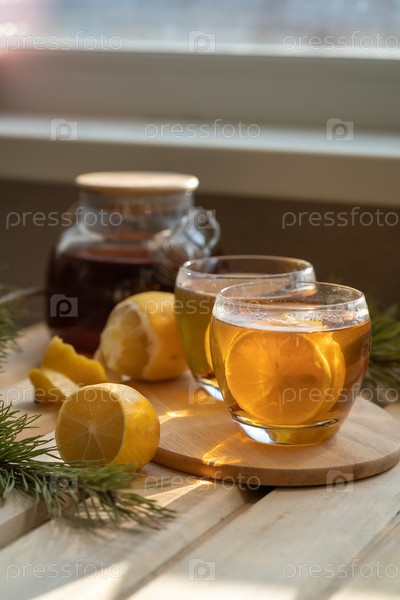 Композиция со стеклянным чайником и стаканами, наполненными чаем с лимоном