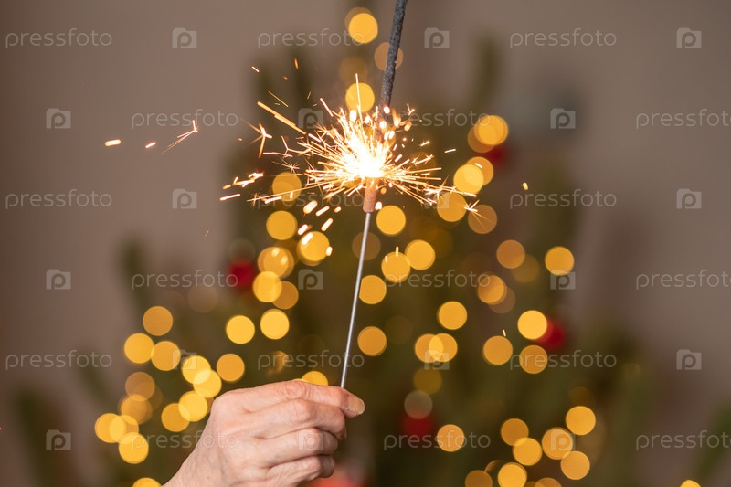 Рука, держащая искрящийся красивый блеск или бенгальские огни. Концепция счастливого рождества и нового года. Золотые волшебные огни