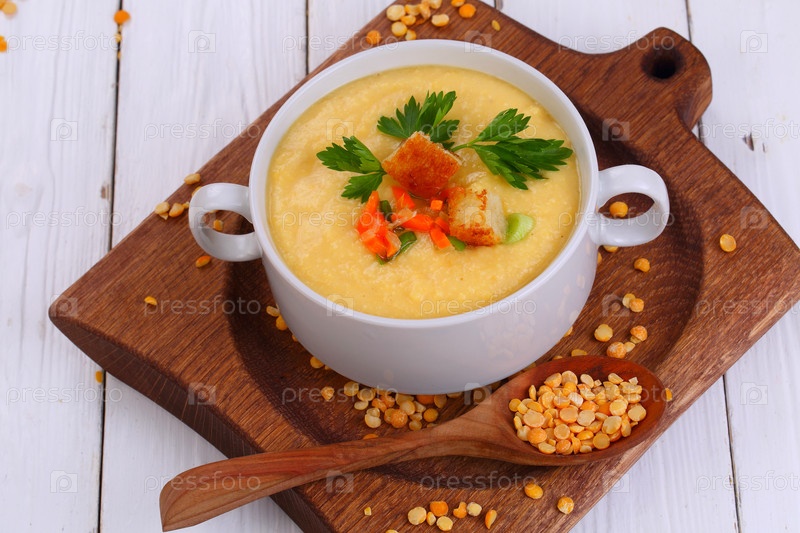 Суп-пюре гороховый на деревянном столе