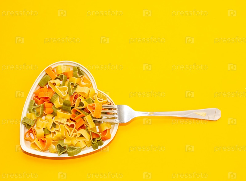 Тарелка в форме сердца, полная цветных макарон на желтом фоне с вилкой. концепция еды. Правильное питание