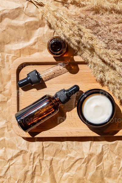 Эфирные масла с каплями пипетки и сливками на деревянном подносе на фоне крафт-бумаги. Сухой тростник или украшение из пампасной травы. Профессиональный флакон для ухода за лицом и телом. Безымянный пакет