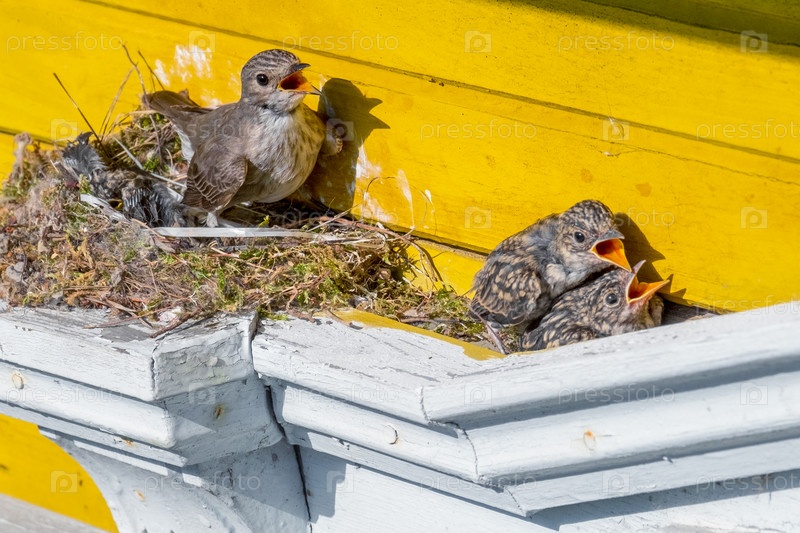 Самка соловья с птенцами в гнезде с открытыми клювами. Лускиния