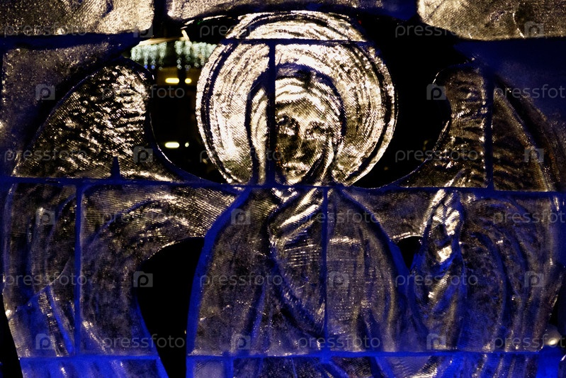 Ледяная скульптура. Ангел с крыльями. Праздник Богоявления. Люди купаются в проруби. Близко-пу