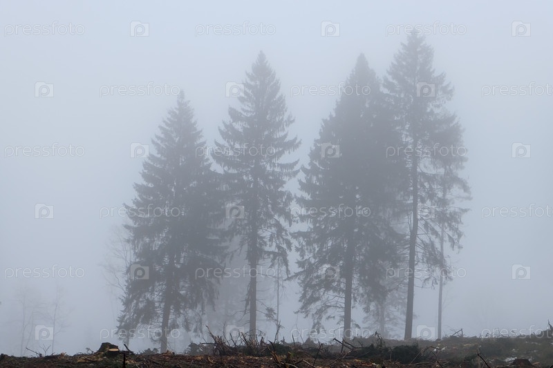 Загадочный темный осенний лес в тумане с деревьями и ветвями