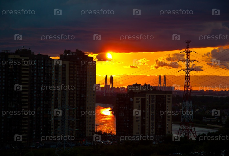 Красный закат над новостройками в Санкт-Петербурге