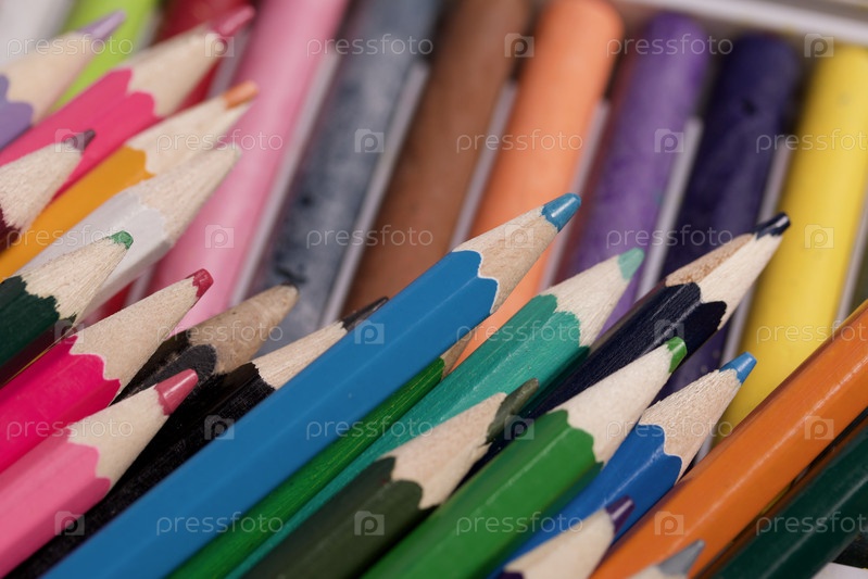 Цветные карандаши и пастель для рисования. Вид сверху. Крупный план