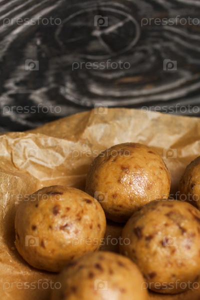 Полезные домашние сладости. Кокосовая мука с темным шоколадом. В виде шариков. На сосновых досках