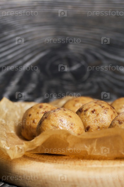 Полезные домашние сладости. Кокосовая мука с темным шоколадом. В виде шариков. На сосновых досках