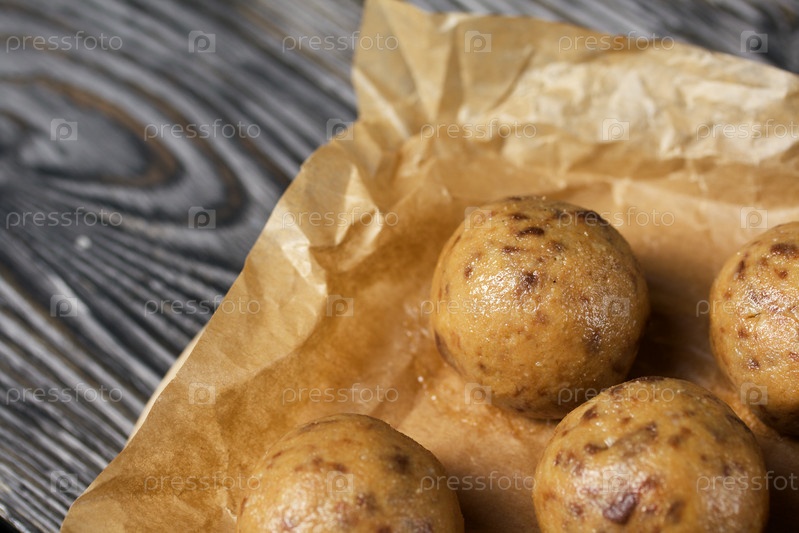Полезные домашние сладости. Кокосовая мука с темным шоколадом. В виде шариков. На сосновых досках