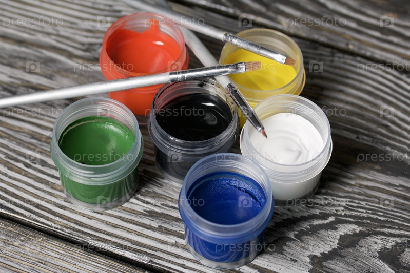 Набор гуаши и кистей. Открытые банки с краской. На сосновых досках. Крупный план