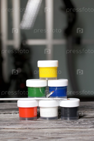 Набор гуаши и кистей для рисования. Банки с краской стоят в пирамиде. На сосновых досках