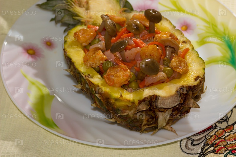 Салат из креветок, кальмаров, корейской моркови и зеленого горошка с грибами в ананасе на тарелке