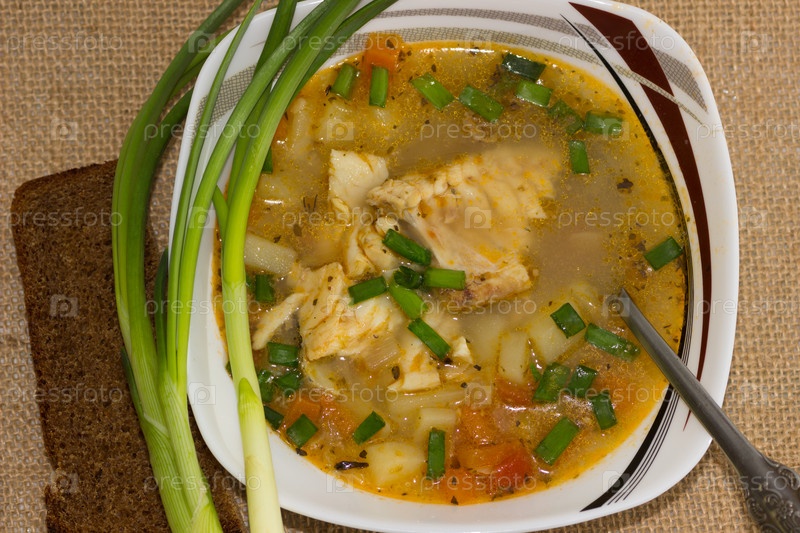 Миска супа из трески, помидоров и зеленого лука с кусочком ржаного хлеба на салфетке