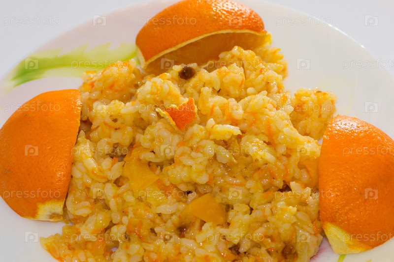 Постный плов с перцем и барбарисом на тарелке, украшенной апельсинами