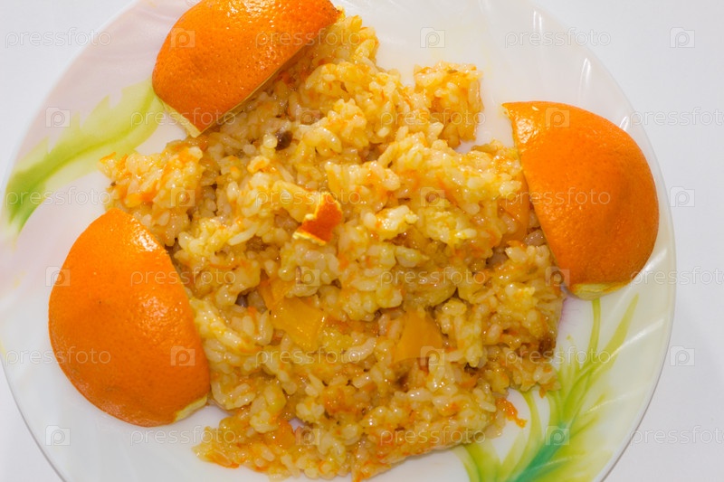 Постный плов с перцем и барбарисом на тарелке, украшенной апельсинами