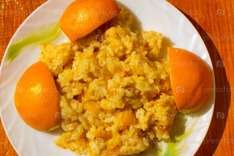 Постный плов с перцем и барбарисом на тарелке, украшенной апельсинами