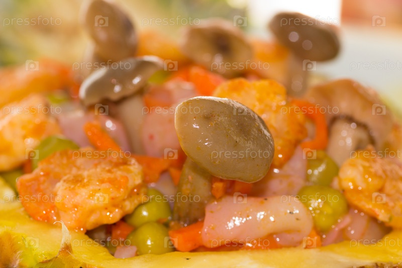 Салат из креветок, кальмаров, корейской моркови и зеленого горошка с опятами подается в ананасе