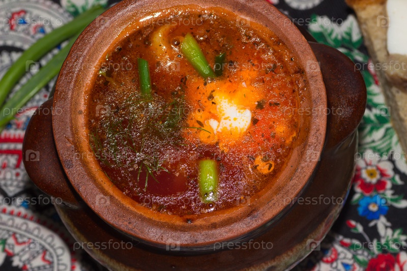 Борщ - суп с капустой, свеклой и свининой - в глиняном горшочке с салом на кусочке хлеба и пером зеленого лука