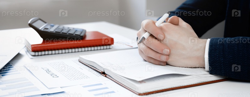 Крупным планом мужские руки. Офисный работник за рабочим местом. Менеджер работает