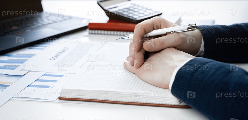 Крупным планом мужские руки. Офисный работник за рабочим местом. Менеджер работает