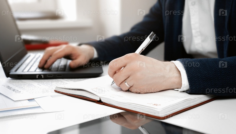 Крупным планом мужские руки. Офисный работник за рабочим местом. Менеджер работает