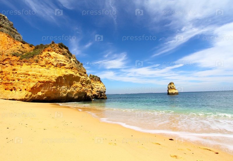 Скалистый пляж на закате, Лагос, Португалия. Счетчик света. Путешествия и бизнес фон
