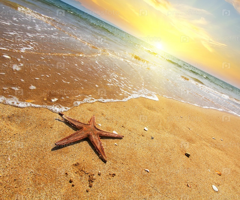Морская звезда на берегу моря на закате. Винтажный стиль. Концепция путешествия. Элемент дизайна