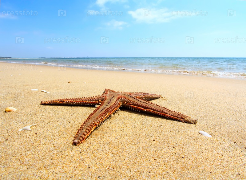 Морская звезда на берегу моря на закате. Винтажный стиль. Концепция путешествия. Элемент дизайна