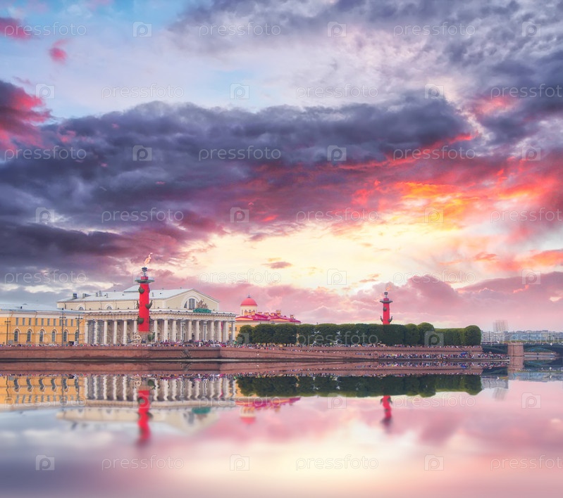 Классический вид на речной пейзаж Санкт-Петербурга (Санкт-Петербург) на закате. Стрелка Васильевского острова. Река Нева. Растральные колонны с огнями. Лето в России