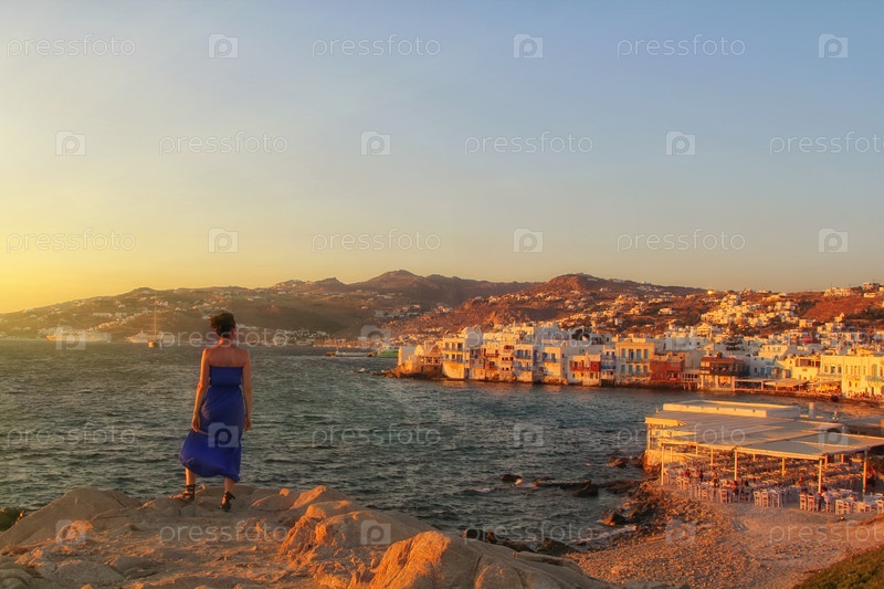 Привлекательная молодая женщина в голубом платье с видом на Маленькую Венецию на острове Миконос, Греция