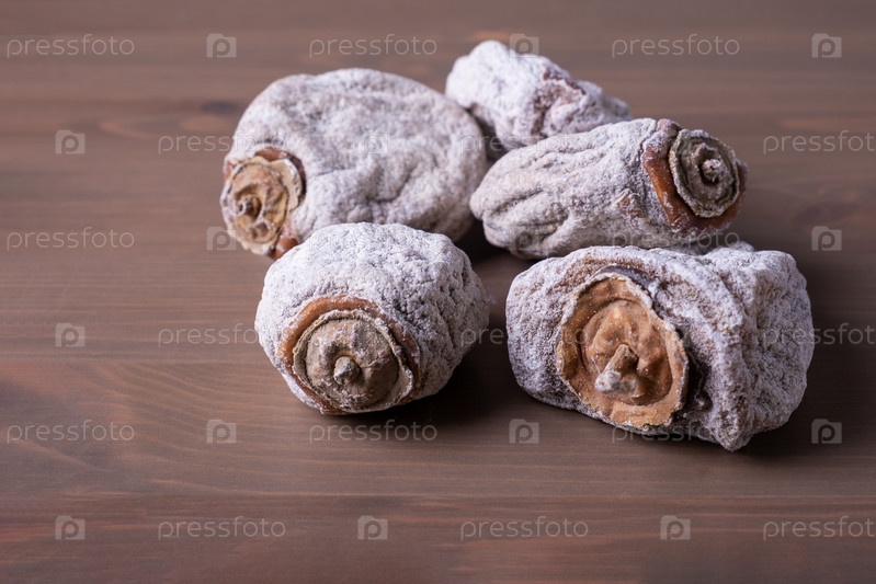 Несколько сушеных плодов хурмы на деревянной поверхности