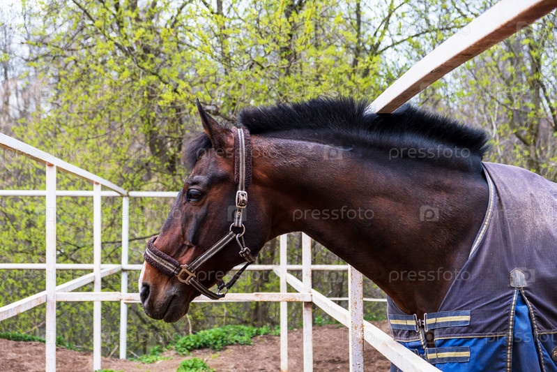 Гнедая лошадь в одеяле стоит в загоне