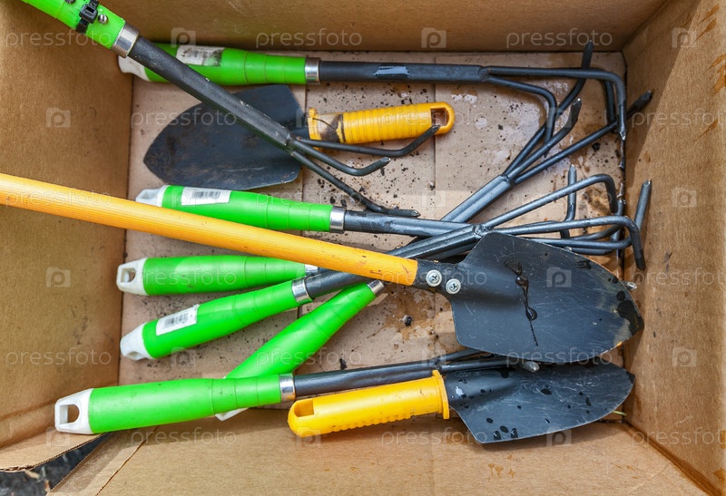 Садовый инвентарь: совок, грабли, лопата в картонной коробке вид сверху